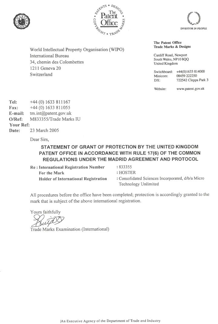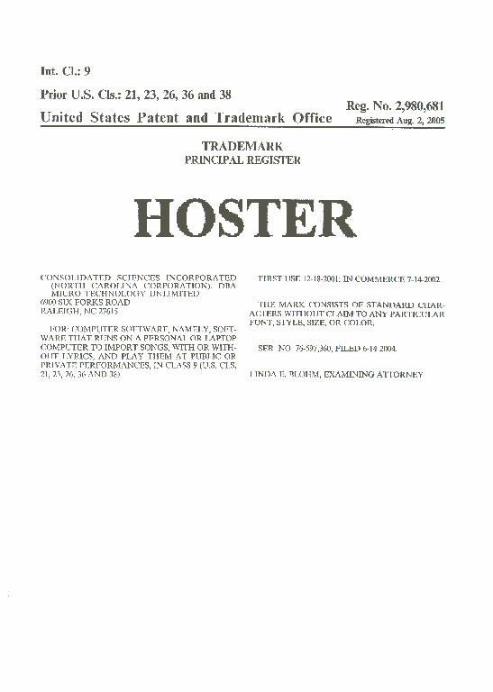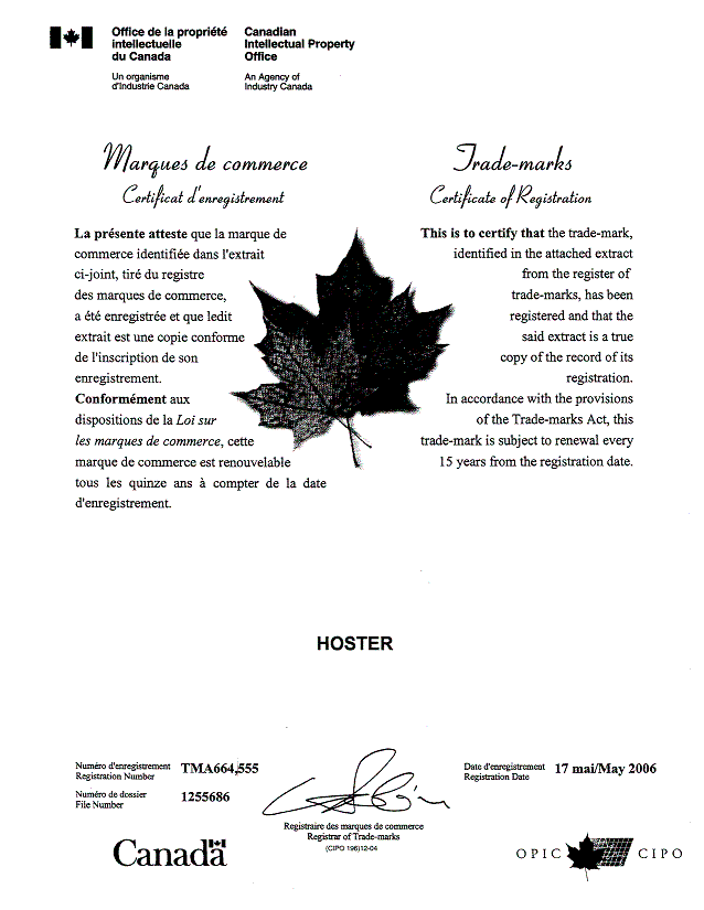 | Hoster Software | USA Registration | WIPO/UK Registration | Canada Registration |